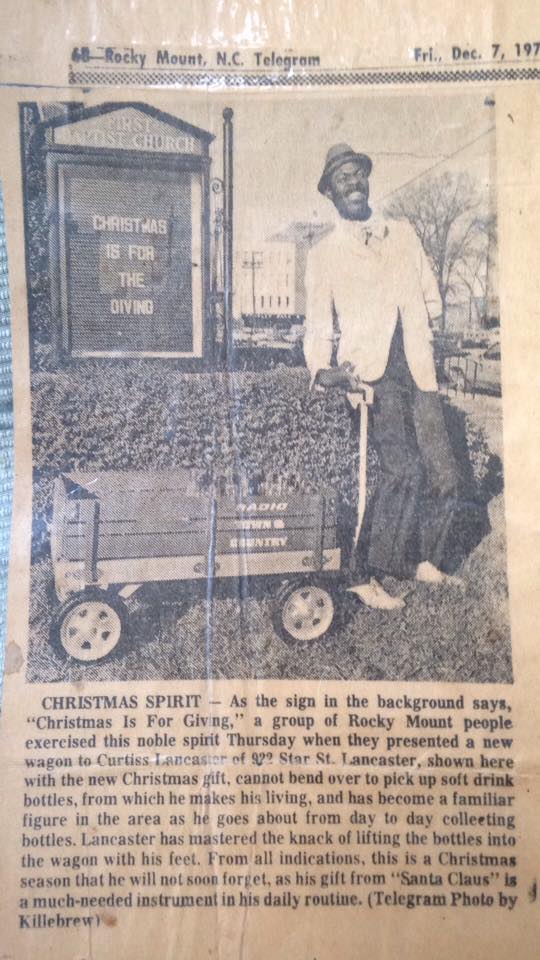 This guy used to walk around Rocky Mount picking up bottles. His hands did not have enough strength in them to pick up the discarded bottle, so he pushed the bottle with his feet over the lip of the wagon; it seems as though someone tied his hands to the wagon so he could pull it. After he collected a wagon-full someone took him to the Pepsi plant where he sold these bottles (to me for a couple of summers) at $.02 a piece. Tell me again about how hard your job is, and yes, my job also. And yes sadly I remember making fun of him, but quite the inspiration.